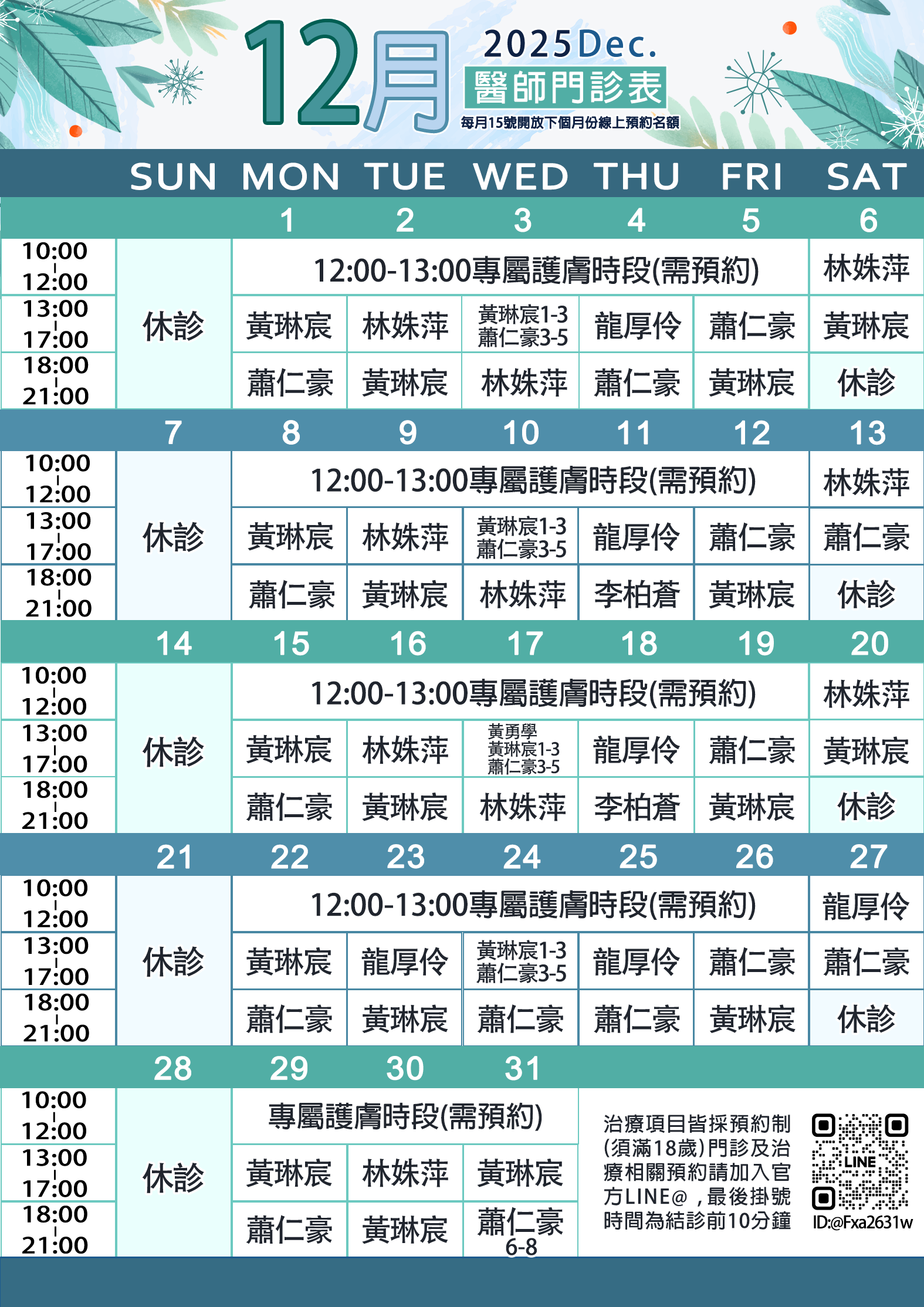 🌺門診表會若有變動,會另行公告後再電話或LINE訊息通知更改預約時間,造成不變敬請見諒🙏